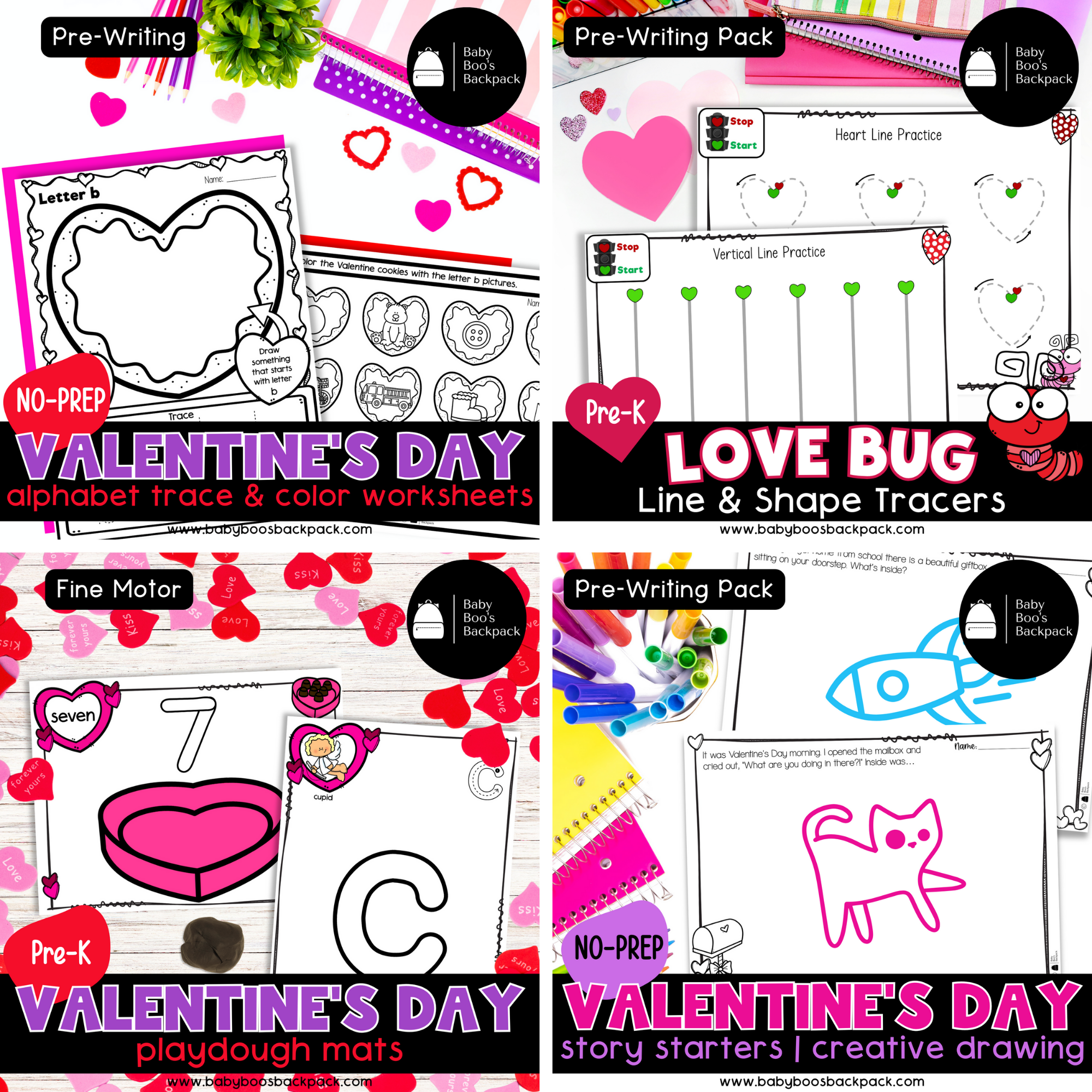 Celebrate Valentine's Day with our writing bundle for preschoolers! Boost letter recognition with fun coloring sheets, and enhance their hand control with playful activities such as line & shape tracing and playdough mats. Spark creativity with our adorable story starter drawing sheets!