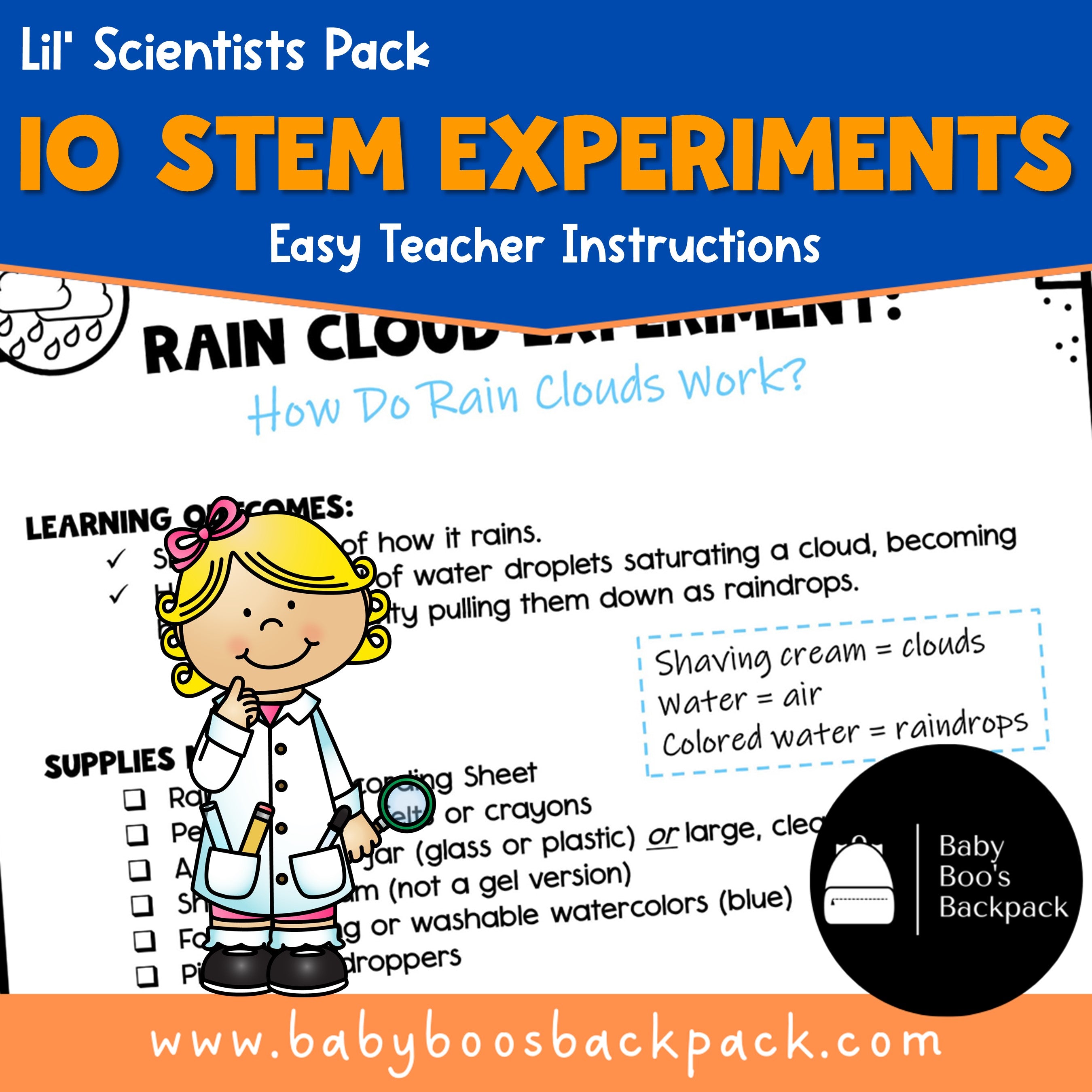 -10 STEM Experiments with One-Page Teacher Instructions that include learning outcomes, a supply list and step-by-step instructions.