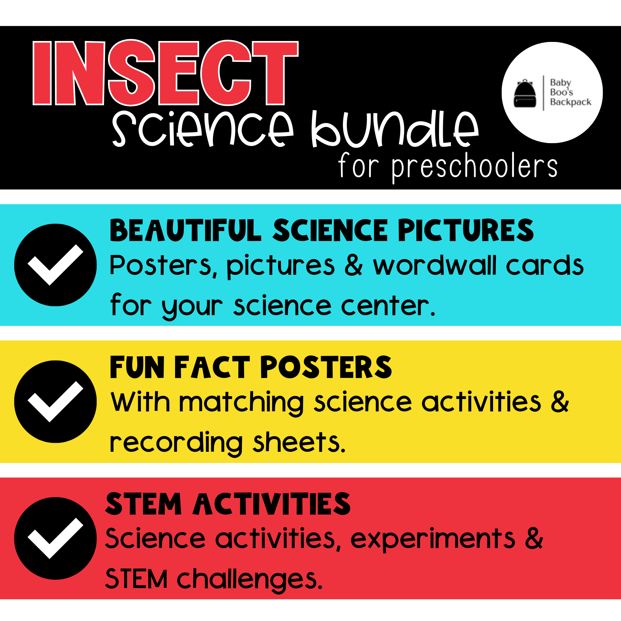 Each unit comes with clear teacher instructions, simple worksheets & easy recording sheets to make your life easier. All of the activities encourage thoughtful investigation while having fun! Get all your preschool bug science with this one resource!