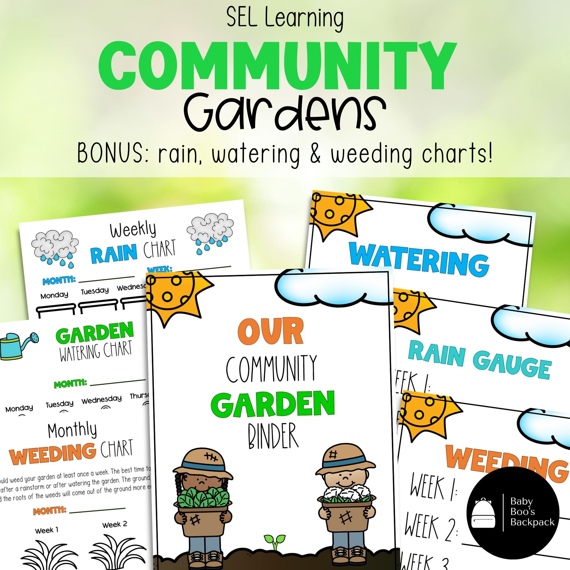 *BONUS: Community Garden Binder Cover, Watering Chart, Weeding Chart, Rain Chart, Rain Gauge Instructions, Gardening Chore Charts (3) (color).